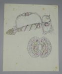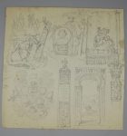 - Deux dessins (non signés) sont joints à cet ensemble : 1. Poignée d'épée richement ornée (mine de plomb avec rehauts d'aquarelle, 22 x 18 cm, qq. rousseurs). 2. Feuille comprenant 7 croquis à la mine de plomb, 18 x 18 cm (cerf dans un bois, colonnes, cavalier, etc.).