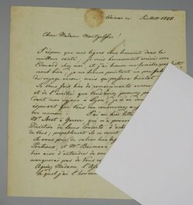 Il revient de tournée et retrouve sa famille. " Je me trouve pourtant un peu fatigué du voyage encore, mais ça passera bientôt. Je vous fais bien des remerciements encore de la bonté et de l'amitié que vous aviez prouvé pour moi pendant mon séjour à Lyon ; je m'en souviendrai toujours []. J'ai eu hier lettre de mon ami Mr Soret à Genève, qui m'a prononcé l'intention de la Direction de leurs concerts d'acheter le Piano de Streicher de vous [] ".