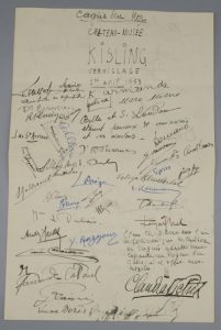 Émouvant souvenir de la toute dernière exposition de Moïse Kisling, au château-musée de Cagnes-sur-Mer, le 1er avril 1953 : il décèdera quelques jours plus tard, le 29 du même mois. Sur 3 grands feuillets, figurent environ 70 signatures d'invités et amis, avec parfois quelques mots : Cécile Sorel, Fernande Cabanel, Marthe Lebasque, Carlos Reymond, le maire de Cagnes Louis Négro, etc., mais également quelques artistes comme son compatriote d'origine polonaise Georges Spiro. Figure également une signature "Picasso" qui n'est pas celle de Pablo, pourtant son voisin, mais peut-être de Françoise Gilot.