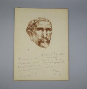 Portrait dédicacé de Charles Maurras agrémenté d'un quatrain. Grand portrait estampé de Charles Maurras, signé du monogramme AL, réalisé au crayon brun. Double dédicace de Maurras en marge : quatrain extrait de la Musique Intérieure (p. 273) : " Allez passant de mauvaise mine / N'approchez pas de notre jardin [...] ". Et, sur la droite, une dédicace " du vieil Hésiode " à l'éditeur et poète Auguste-Pierre Garnier.