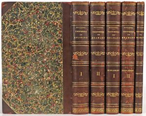 [1726]. 5 vol. in-f° : [16 dont titre gravé]-672, [4]-572 [i.e. 574], [4]-508 [i.e. 524]-iii, [2]-444 [i.e. 454]-xxxiii, 236- [23-1 bl.] pp.; 73 pl. (collation irrégulière mais ex. complet, qqs ff. brunis, pet. taches passim, qqs mouill. lég. et marg. au vol. de suppl., annot. à la plume et 2 cachets à la p. 112 du 2e vol. de suppl.). Rel. moderne : demi-basane à coins, dos fleuronnés dorés à nerfs (mors et coins frottés avec petits manques). Seconde édition (éd. orig. : 1637), la plus complète de cet ouvrage généalogique et héraldique sur la noblesse brabangonne du XVII, siècle par le prieur et historien Butkens (Anvers 1590-1650 La Haye). Outre de nombreux in texto ou pleines pages d'armoiries, de monuments funéraires, épitaphes ou stèles, l'exemplaire est illustré de 73 hors-texte parmi lesquels : le titre allégorique figurant le Brabant entre Charlemagne et St-Albert par Borrekens d'après van Diepenbeke, le portrait du prince de Rubempré et d'Everberghe, le portrait de l'auteur par Harrewijn d'après van Diepenbeke, la carte dépl. du duché de Brabant, 1 grande vue dépliante de la Cour de Bruxelles par Harrewijn, la carte dépl. de la Forêt de Soignes, 19 vues de châteaux, 2 doubles pages figurant des hérauts d'armes, 27 portraits de Granvelle, Hovius... La partie des "Preuves", que l'on trouve en générale dans le tome premier, a été reliée séparément. # Biogr. nat. III-210/213; # Funck 287; # de Ghellinck 430, 454 et 1352; # pas dans BB.
