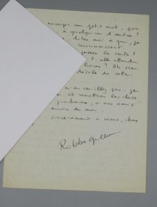 Robbe-Grillet pose un lapin : " Très mal foutu, je suis resté au lit toute la journée d'hier ; aujourd'hui encore ça ne va pas fort ; mais cela n'est rien, j'y suis habitué. Ce qui m'ennuie - et cela considérablement - c'est d'avoir fait faux bond à nos amis bretons pour la signature promise []. Comment s'est passée la vente ? Une vendeuse m'a-t-elle attendu en vain avec mes livres ? Ah vraiment je suis désolé de cette sotte histoire [] ".