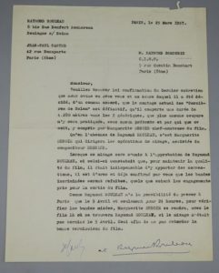 Belle lettre signée par Jean-Paul Sartre (à deux reprises) et Raymond Rouleau, au sujet du montage des Sorcières de Salem, film réalisé par Raymond Rouleau avec un scénario et des dialogues de Sartre, sorti en 1957, d'après la pièce d'Arthur Miller. "Il a été décidé, d'un commun accord, que le montage actuel des "Sorcières de Salem" est définitif, qu'il comporte une durée de 4.280 mètres sans les 2 génériques, que plus aucune coupure n'y sera pratiquée, sous aucun prétexte et par qui que ce soit, y compris par Marguerite Renoir chef-monteuse du film". Ils donnent leurs directives pour les opérations de mixage. "Lorsque ce mixage sera soumis à l'approbation de Raymond Rouleau, si celui-ci constatait que, pour maintenir la qualité du film, il était indispensable d'y apporter des corrections, il est d'ores et déjà confirmé par vous que les bandes incriminées seront refaites, quels que soient les engagements pris pour la sortie du film [...]". Ils ajoutent et signent un dernier détail en P.S. : "Le nom de Raymond Rouleau figurera en fin de générique sur le dernier carton avant la première image du film et sous l'appellation : "réalisation de..." et non sous la formule : "film de Raymond Rouleau", après le titre du film, comme il était stipulé dans le contrat ".