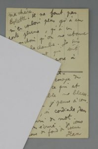 Très belle carte de Cocteau. " Ma chère Bolette. Il ne faut pas m'en vouloir plus qu'à un porte-plume, qu'à un mouchoir qu'on ne retrouve pas dans la chambre. Je suis un objet mort qui sait mal où il se pose à qui et à quoi il appartient. J'essaye du bleu. Tout ce qui est beau, agréable me blesse. Dans cet enfer je pense a vous, si parfaite, si cordiale, dans le sens divin du mot [] ".
