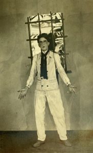 COCTEAU, Jean. Belle photographie originale d'époque en noir et blanc. Cocteau, maquillé et déguisé en ange Heurtebise (dans sa pièce Orphée, 1927), écarte les bras. Papier carte postale. 14 x 8,8 cm.