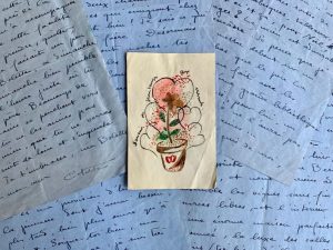 Joint une belle petite aquarelle de Colette, représentant un pot de fleurs entouré de coeurs, avec fleur séchée collée au centre et ces mots : " Souvenir de Printemps aux Mesnuls ". Colette loua aux Mesnuls, non loin de Montfort-L'amaury, une maison, appelée " La Baguenaude ". Elle y entretenait un jardin luxuriant : arbres de Judée, poiriers blancs, glycines, roses, mimosas, potager, etc.