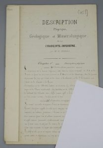 [CHARENTE-MARITIME]. Manuscrit intitulé Description géologique et minéralurgique de la Charente-Inférieure par M. W. Manès. [1853]. 31 pp. in-folio, accompagné d'une carte manuscrite dépliante sur calque (58 x 37 cm).