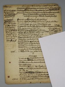 " Mémoire des livres imprimés et mss que j'ai entre mes mains ". Manuscrit très travaillé, avec passages biffés, raturés, annotés en marge. " Manuscrits. Un vol. in-fol. de la main de feu mon père, relié en basane verte contenant plusieurs mémoires et tables généalogiques [ajout en marge : des plus nobles et anciennes familles de Bourgogne] avec une table de ma main contenant les noms de familles & les généalogies. Le nobiliaire des familles de Languedoc maintenues nobles par M. de Bezons intendant de cette province l'an 1667. Deux vol. en parchemin in-fol long de la main de feu mon père [] ".