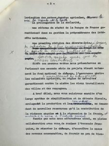 " Le gouvernement se présente devant vous au lendemain d'élections générales où la sentence du Suffrage Universel, notre juge et notre maître à tous, s'est produite traduite avec plus de puissance et de clarté qu'à aucun moment de l'histoire républicaine []. Dès le début de la semaine prochaine nous déposerons sur le bureau de la Chambre un ensemble de projets de loi dont nous demandons aux deux Assemblées d'assurer le vote avant leur séparation. Ces projets de loi concerneront l'Amnistie, la semaine de quarante heures, les contrats collectifs, les congés payés [ces deux derniers éléments rajoutés de la main de L.B.], un plan de grands travaux, c'est à dire d'outillage économique, d'équipement sanitaire, scientifique, sportif et touristique, la nationalisation de la fabrication des armes de guerre, l'Office du blé qui servira d'exemple pour la revalorisation des autres denrées agricoles comme le vin, la viande et le lait [cette dernière phrase rajoutée par L.B.], la prolongation de la scolarité, une réforme du statut de la Banque de France garantissant dans sa gestion la prépondérance des intérêts nationaux, une première révision des décrets lois [ajouts de L.B. " en faveur des catégories les plus sévèrement atteintes des agents des services publics et des services concédés ainsi que des anciens combattants "] [] ".