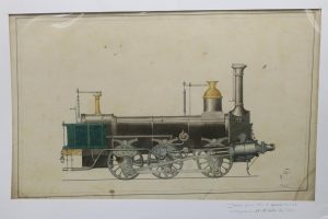Beau dessin d'une locomotive à six roues, de 1840, typique de celles conçues à la fin des années 1830.
