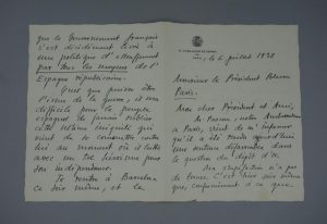 Lettre indignée après la décision du gouvernement français de refuser le retrait des dépôts d'or de la Banque de France. " Ma stupéfaction n'a pas de bornes. C'est hier soir même que, conformément à ce que vous avez bien voulu me communiquer, j'ai indiqué au président Negrin que la sentence dans cette affaire serait renvoyée à huitaine. Je ne pouvais point imaginer que les gens intéressés à la politique d'asphyxie menée contre le peuple espagnol, pousseraient l'audace jusqu'au point de désorienter de façon délibérée l'ancien président du Conseil des ministres []. Il m'est difficile de vous décrire l'immense indignation avec laquelle le Président Negrin a accueilli la nouvelle []. En ce qui me concerne, je dois dire que toutes les épreuves douloureuses auxquelles nous ont soumis ces deux années de guerre, pâlissent face à la terrible évidence que nous avons à affronter aujourd'hui, en voyant que le Gouvernement français s'est décidément livré à une politique d'étouffement par tous les moyens de l'Espagne républicaine. Quel que puisse être l'issue de la guerre, il sera difficile pour le peuple espagnol de jamais oublier cette ultime iniquité qui vient de se commettre contre lui au moment où il lutte avec tel héroïsme pour son indépendance [] ".