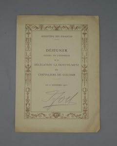 Le maréchal Foch signe un menu de la délégation La Fayette-Metz. Sur un menu offert par le ministère des Finances en l'honneur de la Délégation La Fayette-Metz des Chevaliers de Colomb, Foch a apposé sa grande signature, au crayon.