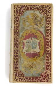 au centre un large compartiment rectangulaire aux angles arrondis, laissant apparaître un décor sous mica, fait de papiers métallisés découpés, de couleur bleu, doré, argenté, vert et rouge, représentant des armes dans un médaillon ovale surmontant et surmonté de trophées comprenant flèches, carquois, torches, etc., dos lisse orné, doublures et gardes de tabis bleu, tranches dorées (reliure de l’époque). Beau specimen de reliure avec décor de papiers métallisés. Bel exemplaire même si les éléments de décor sur les plats se sont décalés avec le temps. Nous n’avons pu identifier les armes.