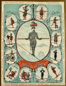 Un grand médaillon central et 12 plus petits représentant des scènes de funambulisme par Frédéric Arsens, funambule espagnol et Charles Blondin (1824-1897), funambule français qui fut le premier à traverser les chutes du Niagara en 1859. Indication en 4 langues " ces numéros seront exécutés en plusieurs représentations ". Rare.