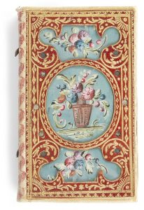 d’une pièce de maroquin rouge décoré à la roulette et aux petits fers et découpé pour laisser apparaître dans un ovale central et dans deux compartiments aux bords droits et courbes un décor floral à la gouache sur fond bleu sous mica, dos lisse orné, miroir au premier contre plat entouré de galons dorés, pochette de tabis bleu serti de galons dorés au deuxième contre plat, gardes de tabis bleu, doubles gardes de papier dominoté, tranches dorées (reliure de l’époque). Très beau specimen de reliure d’almanach, découpée et ornée de charmantes gouaches florales. Exemplaire très bien conservé malgré le dos passé, complet des deux cartes dépliantes.
