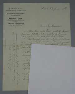 " Votre montre se termine et j'espère arriver prêt pour le 1er août. Le concours pour les instruments décimaux n'a rien révélé de nouveau. Deux concurrents que vous connaissez se présentaient. Je ne puis divulguer leurs noms. Ils auront un encouragement, c'est tout ce qu'ils méritent, d'ailleurs quelle vilaine exécution ! C'est de la serrurerie ! []. Je viens de décrocher la prime annuelle de 1200 f. à la Marine. Mon chronomètre classé 1er et primé, détient le recors depuis la création du concours avec N=1'05 []. M. Villarel est satisfait, enfin ! il a eu 2m25 secondes en un an, soit 0sec39 par jour [] ". Il lui réclame une montre d'automobile, prêtée pour ses expérience et se réjouit de la possibilité d'adoption du système métrique aux Etats-Unis. Il dresse la liste des instruments qu'il expédie à l'Exposition de Saint-Louis, propose ses contacts à Washington et l'informe d'un changement d'organisation à l'usine de Besançon. " Monsieur Leboeuf, notre nouveau directeur d'observatoire à Besançon, est un homme charmant. Il est tout disposer à seconder tous les efforts [] ". Il donne des nouvelles de l'exposition universelle de Saint-Louis [il en recevra le Grand Prix pour sa Leroy 01 pour la complexité de sa fabrication]. " Si vous voulez que les Ephémérides décimales partent à Saint-Louis, veuillez me les expédier de suite. Je fais mon dernier envoi jeudi. Ne pas perdre une minute. Le compteur et la montre sont là-bas, mon frère m'écrit que tout se termine, il y a beaucoup de retard [] ". Il fait des commentaires sur l'exposition de Cluses, parle de ses affaires. "Vous ai-je dit que M. Baillaud [l'astronome Benjamin Baillaud, directeur de l'Observatoire] m'a commandé 2 pendules pour envoyer l'heure à la Tour Eiffel et de là à l'océan ? [] ". Il annonce le transfert de l'Ecole d'horlogerie. " Olivier est navré de voir partir notre musée et notre bibliothèque ". Il évoque encore la mise au point d'instruments et des publications.