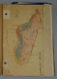 - Note sur les gisements aurifères de Sakazera. Bassin moyen des rivières Mananjera & Antsiatsia (Madagascar N.). Décembre 1912. 20 pp. dactylographiées sur papier pelure + carte dépliante avec annotations manuscrites + 2 manuscrits sur calques avec plans et coupes d'une partie de la rivière Dabolava.