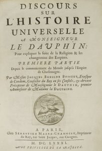 BOSSUET (Jacques-Bénigne). Discours sur l’histoire universelle à Monseigneur le Dauphin. Pour expliquer la suite de la Religion & les changemens des Empires. Paris : Sébastien Mabre-Cramoisy, 1681. — 3 parties en un volume in- 4, (1 f.), 561 ...