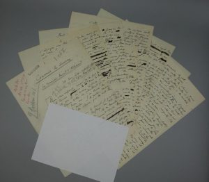 Manuscrit d'un émouvant article de René Benjamin, intitulé " Courrier de Guerre, le Français devant l'Allemand ". Écrit aux premiers jours de la guerre et publié en septembre 1939 dans Candide, il le dédie, sous forme d'une lettre ouverte, à son fils " Jean-Loup, caporal-chef, ligne Maginot " : " Mon cher enfant, puisqu'on se bat là où tu te trouves, et que te voici dans le drame, je me doute que tu as mieux à faire que de lire de longues lettres, en admettant qu'on te les apporte. Mais moi... J'ai besoin de t'écrire, de te parler - de parler, rassure-toi, avec autant de silences que de mots. Place les bien entre les lignes [] ". Son fil, qui combattra dans les troupes américaines, puis en Tunisie, en Italie et en France, fut tué à Mulhouse le 9 février 1945 ; quelques mois plus tard, Benjamin écrira l'Enfant tué.