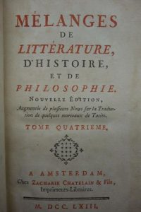 PHILOSOPHIE. Nouvelle édition, augmentée de plusieurs notes sur la traduction de quelques morceaux de Tacite. AMSTERDAM, ZACHARIE CHATELAIN, 1763. Quatre volumes, in-12, pleines reliures de l'époque en veau moucheté. Dos à 5 nerfs cloisonnés, fleuronnés et dorés portant les pièces de titre en maroquin rouge et de tomaison en maroquin vert, filet doré sur les coupes, tranches jaspées de plusieurs couleurs.
