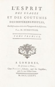 viij, 336 pp. Veau marbré, dos à nerfs orné, tranches marbrées (reliure de l’époque). Édition originale. Jean-Nicolas Démeunier (1751-1814) était un homme politique, député du Tiers États aux États Généraux, sénateur de Toulouse (1808) et comte de l’Empire (1808). Il traduisit de nombreux livres de voyage anglais dont le Troisième voyage de Cook. L’Esprit des usages et des coutumes des différents peuples est son premier ouvrage, en dehors des traductions, dans lequel il se propose de comparer les mœurs, les usages, les coutumes et les lois des différentes nations. L’ouvrage est divisé en 18 parties passant en revue nos principales activités et portant successivement sur l’alimentation, les femmes, le mariage, les enfants et l’éducation, le pouvoir politique, la guerre, la hiérarchie sociale, l’esclavage, la beauté et la parure, la pudeur et la chasteté, l’usage de l’astrologie et des sciences cabalistiques, le vivre en société, les lois pénales, la justice, les supplices, l’homicide, le suicide et les sacrifices humains, la maladie, la médecine, la mort ainsi que les obsèques. “En adoptant comme titre L’Esprit des usages et coutumes, Démeunier entend proposer à l’anthropologie l’équivalent du travail de Montesquieu pour la science politique dans L’Esprit des lois. Il refuse à la fois le dogme et le hasard, le modèle européanocentrisme et l’absurde. Les usages, les coutumes, si aberrants nous semblent-ils, doivent avoir un sens qu’il entreprend de retrouver, en les comparant les uns aux autres, en montrant comment ils ont évolué et souvent perdu leur justification première” (Michel Delon, La Copie sadienne, in Littérature, février 1988, n° 69, p. 89). L’intérêt de ce livre n’échappa en rien à Sade pour qui ce fut une importante source de renseignements : “Comment Sade aurait-il pu ne pas se réjouir de trouver sur des pages des exemples d’anthropophagie, d’infanticide, de débauches sexuelles, etc. ? L’information se trouve toute préparée pour lui, sous forme de listes de cas, dont chacun est exposé avec sa référence en un court paragraphe. Il lui est facile de recopier tous les exemples, d’en choisir les plus probants pour sa thèse, d’en ajouter ou intercaler de nouveaux, ou encore de mêler plusieurs chapitres. Le souci de neutralité scientifique chez un encyclopédiste comme Démeunier, laisse Sade libre d’utiliser les renseignements à ses propres fins, de les réorienter dans un sens nouveau” (ibidem). Dos légèrement passés, quelques petits travaux de vers, coins émoussés et quelques épidermures sur les plats. Très bon état intérieur avec seulement des restaurations aux gardes.