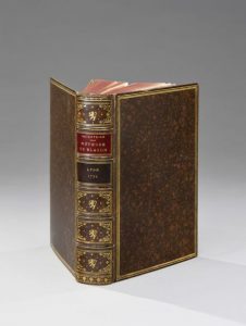 Un volume, in-8, de (8) ff., 619 pp., (35) pp., pleine reliure en veau moucheté. Dos à 5 nerfs cloisonné, fleuronné et doré portant une pièce de titre en maroquin rouge et une en maroquin brun, triple filet doré encadrant les plats, filets dorés sur les coupes, dentelle dorée intérieure, tranches rouges.