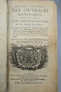Histoire érudite de la ville de Lyon par le père Ménestrier, jésuite, dans lequel celui-ci examine du point de vue critique les différents ouvrages qui ont été écrits sur Lyon. Dissertation sur l'origine de la ville de Lyon. L'ouvrage fut un essai préparatoire à une grande histoire de la ville de Lyon parue en 1696 au format in-folio.