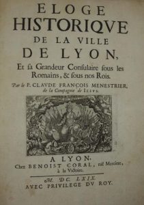 MENESTRIER (Claude François). ÉLOGE HISTORIQUE DE LA VILLE DE LYON, et sa grandeur consulaire sous les romains, & sous nos rois. LYON, BENOIST CORAL, 1669. Un volume, grand in-4, de frontispice, (25) ff., 44 pp., (1) f. mnq, 62 pp., 92 pp., 64 pp., (1) f., 76 planches, pleine reliure ancienne en veau havane. Dos à 5 nerfs cloisonné, fleuronné et doré portant une pièce de titre en maroquin rouge, roulette dorée sur les coupe, tranches jaspées. Coiffe supérieure accidentée ainsi que les mors voisins, deux coins émoussés. Deux vignettes ex-libris sur le contre plat supérieur.