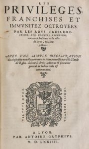 RELIÉ AVEC : LES PRIVILÈGES FRANCHISES ET IMMUNITEZ OCTROYÉES PAR LES ROYS TRES CHRESTIENS, AUX CONSULS, ESCHEVIN, MANANS & HABITANS DE LA VILLE DE LYON & À LEUR POSTÉRITÉ. AVEC UNE AMPLE DÉCLARATION DES CHOSES PLUS NOTABLES, CONTENUES EN ICEUX, RECUEILLIE PAR M. CLAUDE DE RUBIS... A LYON, PAR ANTOINE GRYPHIUS, 1574.