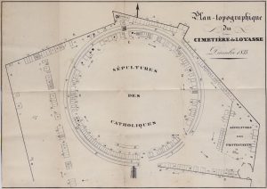 [BEUF (Pierre)]. LE CIMETIÈRE DE LOYASSE. Description de tous les monuments qui existent dans ce cimetière, avec le relevé exact des inscriptions gravées ; par P... suivi d'un plan topographique des lieux, et de planches donnant le dessin des monuments les plus remarquables. LYON, DE LA LIBRAIRIE DE P. BEUF, 1834. Un volume, in-8, de (2) ff., XVI pp., 337 pp., (1) p., 11 planches et un grand plan topographique dépliant, demi-reliure de l'époque en basane noire. Dos à 5 nerfs décoré de palettes dorées entre les nerfs et portant le titre doré, tranches jaspées, premier plat de la couverture conservé. Petites salissures claires sur les trois premiers feuillets, rares piqûres éparses, frottements légers sur le dos. Bon exemplaire.
