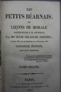 DELAFAYE (Mme Julie). LES PETITS BÉARNAIS, ou leçons de morale convenable à la jeunesse. PARIS, EYMERY, 1824. Quatre volumes, in-18, pleines reliures de l'époque en veau porphyre. Dos lisses très ornés et dorés portant les titres dorés, guirlandes dorées en encadrement des plats, tranches peignées. Bel exemplaire très frais.