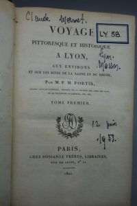 Description de Lyon, des rives du Rhône, colline Sainte Foy et productions de ce coteau, vallon de Saint Genis, fontaine de la Mauche, chaussée Perrache - destruction de Lyon par les barbares - place Bellecour, monuments et état en 1790 - joutes et combats sur l'eau - navigation sur le Rhône et la Saône, forme des bateaux, mines de Rive de Gier - halle aux grains, port des Cordeliers, colline de Fourvières - fêtes de la Bazoche - soies de France et manufactures - entrée de Henri IV à Lyon, les Brotteaux, édifices du moyen âge - etc.