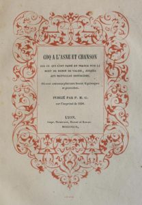 [GONON (P. M.)]. COQ A L'ASNE ET CHANSON, sur ce qui s'est passé en France puis la mort de Henry de Valois, jusques aux nouvelles deffaictes (sic). Où sont contenus plusieurs beaux équivoques et proverbes. LYON, DUMOULIN, RONET & SIBUET, 1843. Un volume, in-8, de (1) 24 pp., demi-reliure de l'époque en basane marine. Dos lisse décoré de filets dorés et portant le titre doré en long. Très légers frottement sur les mors, mais bel exemplaire.