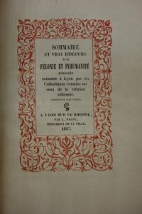 GONON (Pierre Marie). SOMMAIRE ET VRAI DISCOURS DE LA FÉLONIE ET INHUMANITÉ ENRAGÉE COMMISE A LYON PAR LES CATHOLIQUES ROMAINS SUR CEUX DE LA RELIGION RÉFORMÉE. A LYON SUR LE RHOSNE, PAR J. NIGON, 1847. Un volume, in-12, de 35 pp., 10 pp.,
