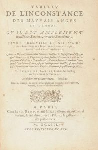 L’ANCRE (Pierre de). Tableau de l’inconstance des mauvais anges et démons. Où il est amplement traicté des Sorciers, & de la Sorcellerie. Livre tres-utile et necessaire non seulement aux Juges, mais à tous ceux qui vivent sous les loix...