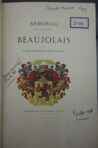 LA ROCHE LA CARELLE (Baron Ferdinand de). ARMORIAL DE LA PROVINCE DU BEAUJOLAIS. LYON, IMPRIMERIE DE LOUIS PERRIN, 1853. Un volume, grand in-8, de (2) ff., 110
