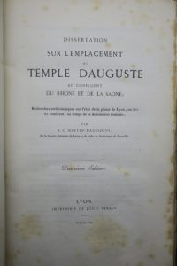 D'AUGUSTE AU CONFLUENT DU RHÔNE ET DE LA SAÔNE. Recherches archéologiques sur l'état de la plaine de Lyon, où îles du confluent, au temps de la domination romaine. LYON, IMPRIMERIE DE LOUIS PERRIN, 1853. Un volume, in-8, de (2) ff., 48 pp., 15 pp., demi-reliure ancienne à la bradel en percaline, titre doré sur le dos. Quelques rousseurs éparses.