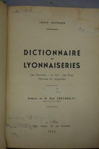 MAYNARD (Louis). DICTIONNAIRE DE LYONNAISERIES. Préface de Me Paul Creyssel. LYON, CHEZ L'AUTEUR, 1932. Quatre volumes, in-4, demi-reliures à coins de l'époque en chagrin vert. Dos à 4 nerfs décorés de filets dorés et d'une palette dorée portant les titres dorés, couvertures conservées. Ex-libris manuscrits, en partie effacés, sur les pages de titre. Bon exemplaire.