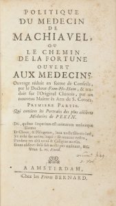 [LA METTRIE (Julien Offray de)]. Politique du médecin de Machiavel, ou le chemin de la fortune ouvert aux médecins. Ouvrage réduit en forme de Conseils, par le Docteur Fum-Ho-Ham, & traduit sur l’Original Chinois, par un nouveau Maître ès Arts...