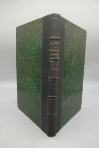 demi-reliure de l'époque en chagrin nuit. Dos à 5 nerfs portant seulement le titre doré, tranches jaspées. Ex- libris manuscrit et étiquette sur la page de titre.