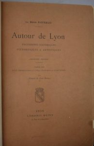 RAVERAT (Le Baron Achille). AUTOUR DE LYON. Excursion historiques pittoresques & artistiques. Deuxième édition. Première série à quatrième série. LYON, METON, s. d. (1882 ?). Un volume, grand in-8, demi-reliure de l'époque en chagrin bronze. Dos à 5 nerfs décoré de palettes dorées entre les nerfs et portant le titre doré. Dos uniformément éclairci, coins émoussés, commentaires manuscrit au crayon papier dans les marges. Bon exemplaire.