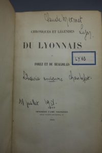 [VINGTRINIER (Aimé)]. CHRONIQUES ET LÉGENDES DU LYONNAIS DU FOREZ ET DU BEAUJOLAIS. LYON, IMPRIMERIE D'AIMÉ VINGTRINIER, 1855. Un volume, in-8, de (3) ff., 266 pp.,