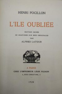 FOCILLON (Henri). L'ÎLE OUBLIÉE. PARIS,LÉON PICHON, 1920. Un volume, grand in-8, pleine reliure en chagrin fauve. Dos à trois nerfs portant un décor et le titre estampés à froid. Filet à froid autour des plats, filet à froid sur les coupes, intérieur doublé et encadrement par une guirlande à froid, couverture conservée.
