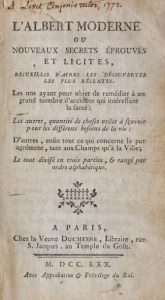 Par Pons-Augustin Alletz, avec la collaboration de Pierre Guy, commis de la veuve de Nicolas-Bonaventure Duchesne. "L'Albert moderne" emprunte son titre au Grand Albert, un célèbre ouvrage de magie populaire attribué au théologien et encyclopédiste Albert le Grand (1200-1280). La rédaction du Grand Albert commence vers le milieu du 13e s. et aboutit à sa forme définitive à la fin du 16e s. Malgré la condamnation de l'Église, il connaît un grand succès et est constamment réédité.