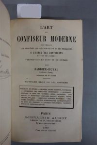 BARBIER - DUVAL. L'ART DU CONFISEUR MODERNE, contenant les procédés les plus nouveaux et les meilleurs à l'usage des confiseurs et des ménagères. Fabrication en gros et en détail par Barbier - Duval confiseur à Nancy. PARIS, AUDOT, 1879. Un volume, in-8, de VII pp., 828 pp., (1) ff., demi-reliure en chagrin cerise. Dos à 5 nerfs portant seulement le titre doré, tranches jaspées. Bon exemplaire.