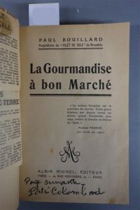 BOUILLARD (Paul). LA GOURMANDISE À BON MARCHÉ. PARIS, ALBIN MICHEL, 1925. Un volume, in-12, de 288 pp., demi-reliure en chagrin cerise. Dos à 5 nerfs portant seulement le titre doré. Bon exemplaire. Quelques recettes, manuscrites ou imprimées, ont été ajoutées sur la première garde et au dos du titre.