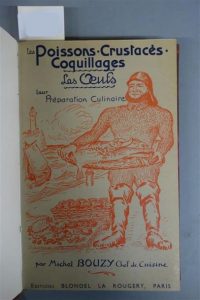 BOUZY (Michel). LES POISSONS, CRUSTACÉS, COQUILLAGES - LES OEUFS - LEUR PRÉPARATION CULINAIRE. PARIS, BLONDEL LA ROUGERY, 1950. Un volume, in-8, de 288 pp., demi-reliure en chagrin rouge. Dos lisse décoré et doré portant le titre doré, tranches jaspées, couverture conservée. Bon exemplaire.