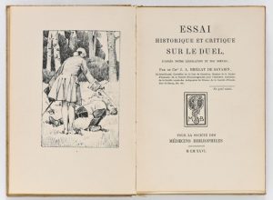 BRILLAT SAVARIN (Jean Anthelme). ESSAI HISTORIQUE ET CRITIQUE SUR LE DUEL, d'après notre législation et nos moeurs. PARIS, SOCIÉTÉ DES MÉDECINS BIBLIOPHILES, 1926. Un volume, petit in-8 carré, de XII pp., 135 pp. (2) ff., reliure cartonné à la bradel, titre doré au dos, couverture et dos conservés. Agréable exemplaire.