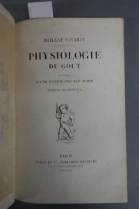 BRILLAT SAVARIN. PHYSIOLOGIE DU GOÛT. Précédée d'une notice par Alphonse Karr. Dessins de Bertall. PARIS, FURNE & Cie, 1864. Un volume grand in-8, de (2) ff., 459 pp., demi-reliure de l'époque en chagrin marron. Dos à 4 nerfs cloisonné et fleuronné portant le titre doré, plats habillés de percaline lie de vin, tranches dorées. Rares rousseurs claires éparses, Légers frottements.