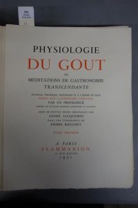 BRILLAT SAVARIN - JACQUEMIN. PHYSIOLOGIE DU GOÛT. Ou méditation de gastronomie transcendante. Ouvrage théorique, historique et à l'ordre du jour dédié aux gastronomes parisiens. Par un professeur membre de plusieurs sociétés littéraires et savantes. PARIS, FLAMMARION, 1951. Deux volumes, in-4, en feuilles sous chemises rempliées illustrées et imprimées en deux couleurs. Doubles emboîtages éditeur.